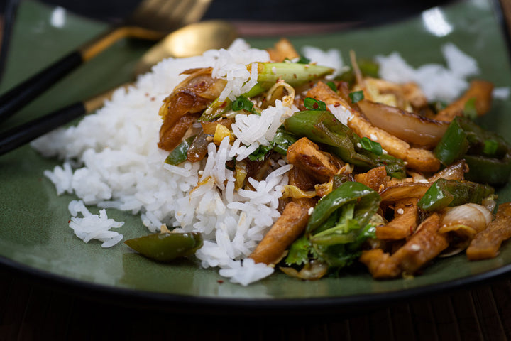 Learn to make a tofu stir fry by following this recipe. All you need is tofu, veggies of your choice, rice or farro, and 20 mins.
