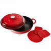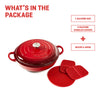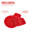 2 x silicone handle covers. 1 x silicone potholder. The silicone handle covers and potholder will protect your hands and kitchen tops from the heat.